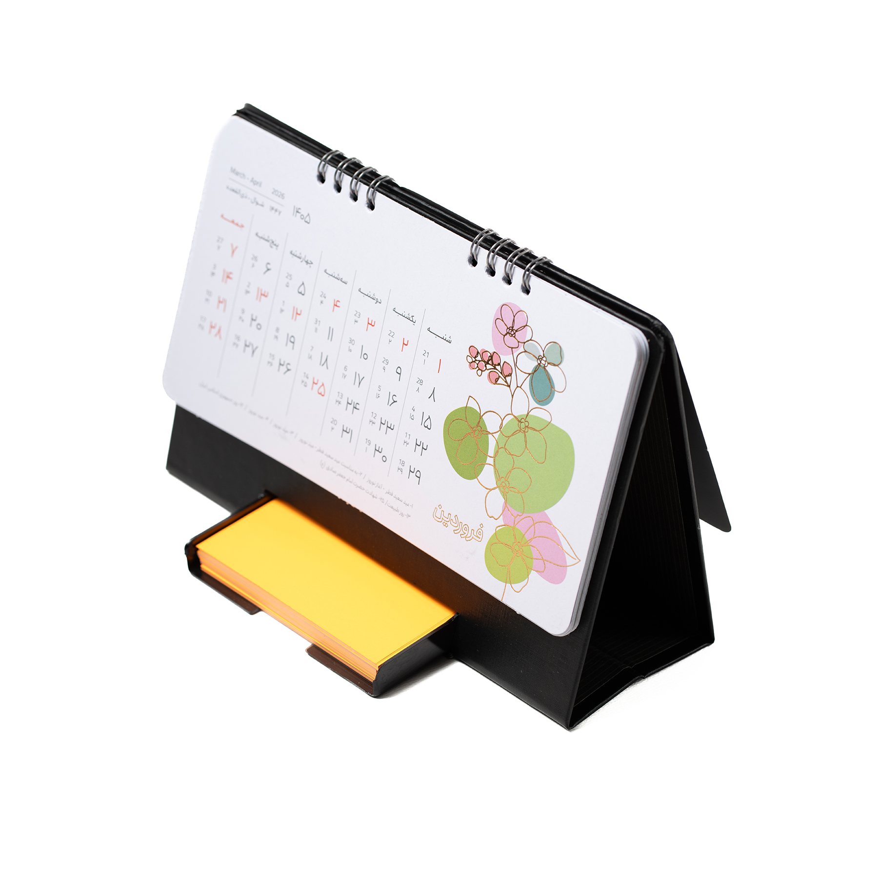 تقویم رومیزی هما پلاس با قطع ۱۴ × ۲۱ سانتیمتر طراحی شده و با صحافی فنری استحکام و سهولت در ورقزدن را فراهم میکند. پایهی تقویم از گالینگور مشکی باکیفیت ساخته شده و همراه با یک یادداشت ۱۰ × ۱۰ سانتیمتر ارائه میشود. این مجموعه در یک جعبه اختصاصی و شکیل بستهبندی شده و گزینهای مناسب برای هدیههای سازمانی و استفاده روزمره است.