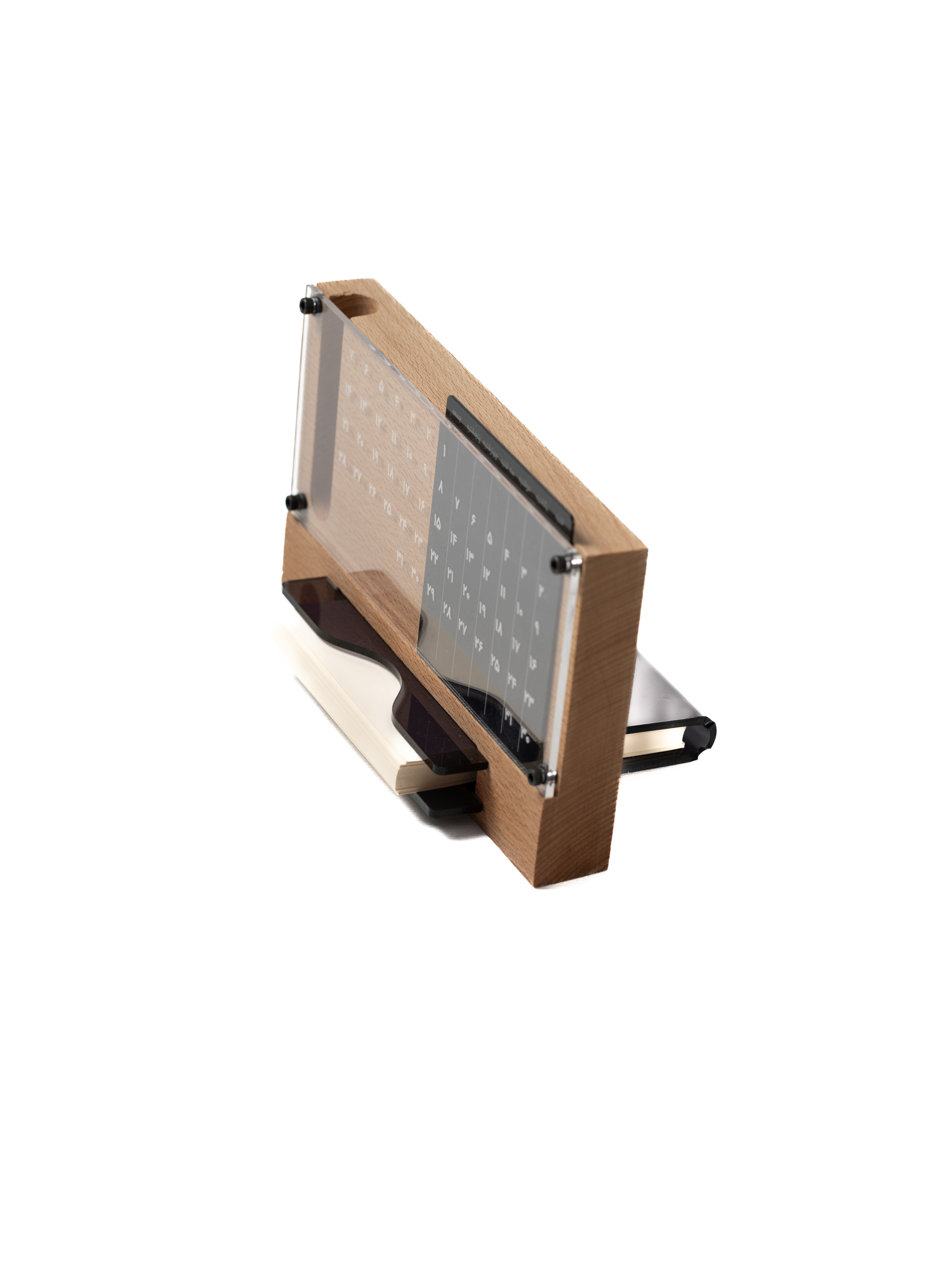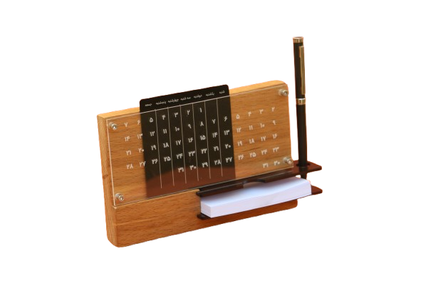 تقویم رومیزی سپیدار یک تقویم ماندگار و بدون محدودیت زمانی است؛ به این معنا که تنها به یک سال خاص تعلق ندارد و میتوان آن را برای سالیان متمادی استفاده کرد. این محصول از یک پنل چوبی راش وارداتی با ابعاد 17×11 سانتیمتر و ضخامت 1.5 سانتیمتر ساخته شده است. روی این پنل، یک لایه پلکسی شفاف به ابعاد 17×7 سانتیمتر قرار گرفته که روزهای سال روی آن حک شدهاند. بین این دو لایه، یک صفحه مشکی متحرک قرار دارد که نقش نشانگر روزهای هفته را ایفا میکند و با حرکت آن، روز موردنظر مشخص میشود. در بخش پایینی محصول، یک شیار کاربردی طراحی شده که میتواند برای قرار دادن برگههای یادداشت مورد استفاده قرار گیرد. همچنین در کنار آن، جای مخصوص قرارگیری خودکار در نظر گرفته شده تا محصول کارآمدتر و کاملتر باشد. تقویم سپیدار امکان نصب پلاک فلزی و همچنین لیزر اختصاصی را برای اعمال هویت بصری و برندینگ دلخواه شما فراهم میکند.